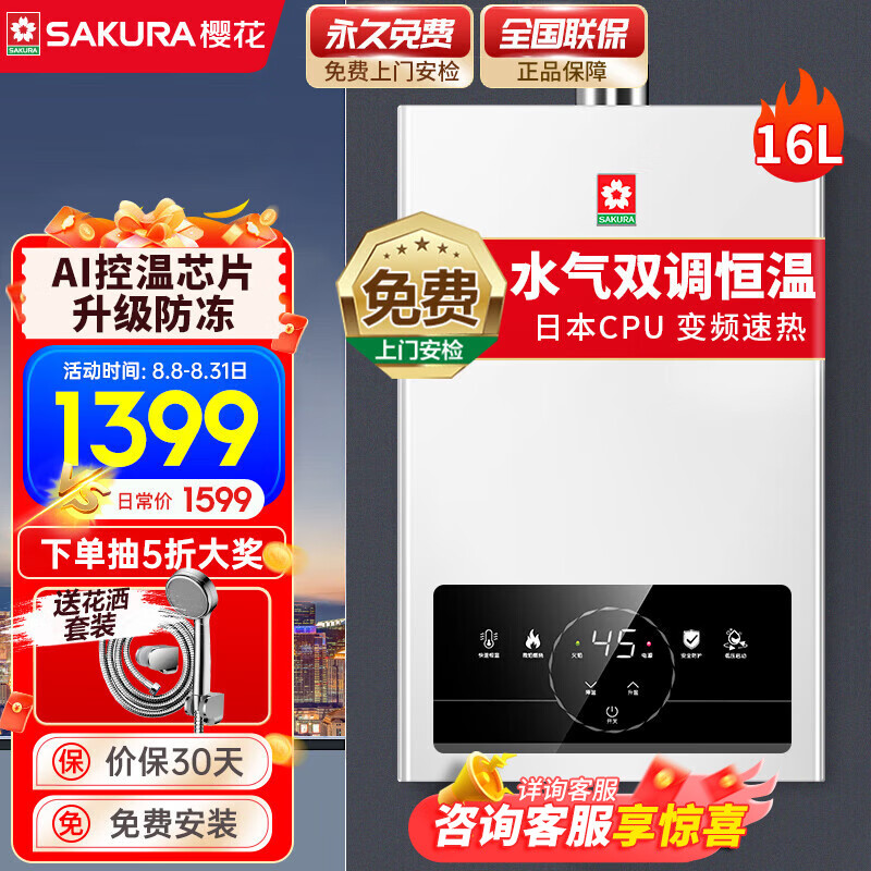 樱花(SAKURA)燃气热水器水气双调智能精控恒温直流变频降噪触控强排式热水器低压启动多重防护 16L NJP007AS防冻款价格:1699.00元!