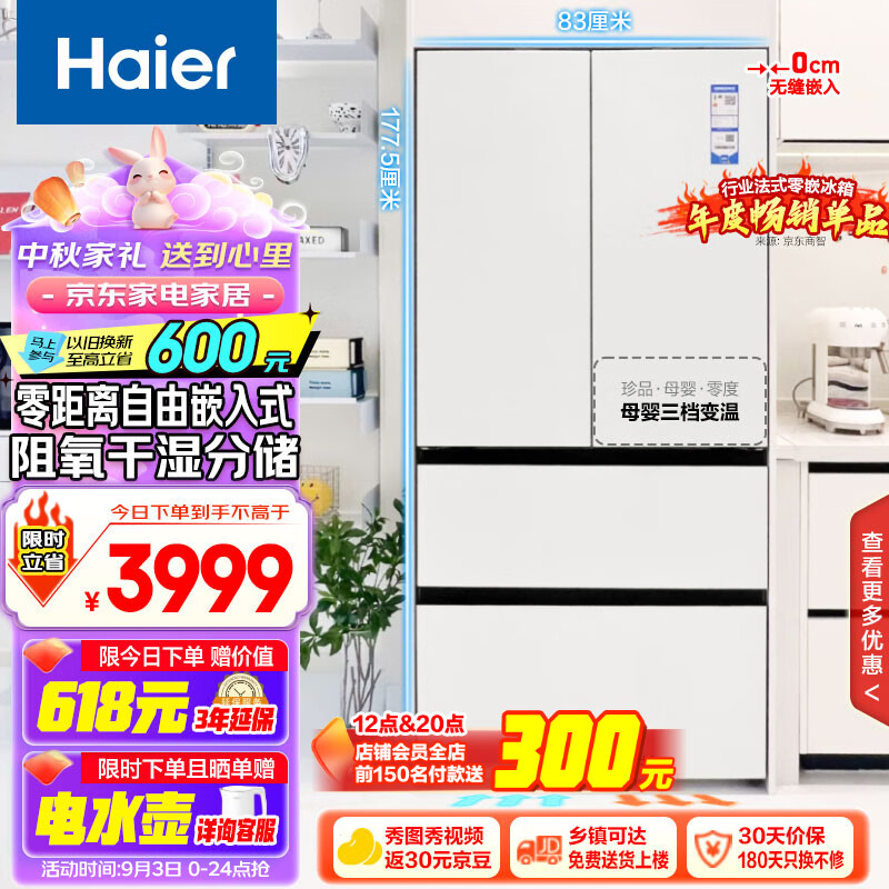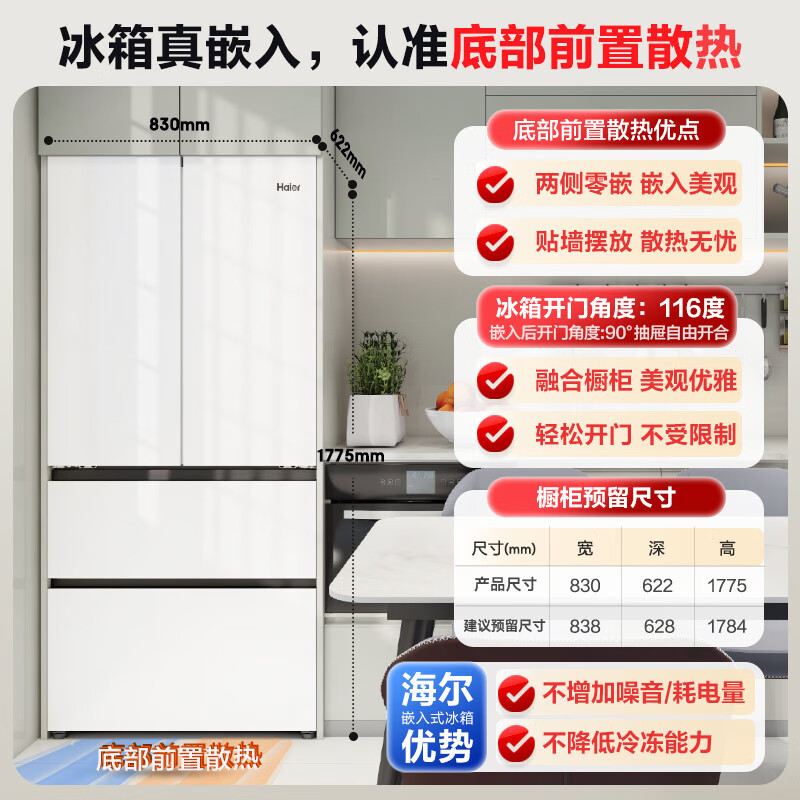 海尔(Haier)460L零距离自由嵌入多门四开门法式电冰箱家用白色一级能效超薄嵌入式底部散热BCD-460WGHFD4DW9U1价格:4899.00元!