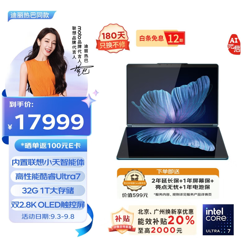 联想YOGA Book 9i AI元启13.3英寸AIPC双屏翻转笔记本电脑 英特尔酷睿Ultra7 32G 1T 2.8KOLED触控屏价格:17999.00元!
