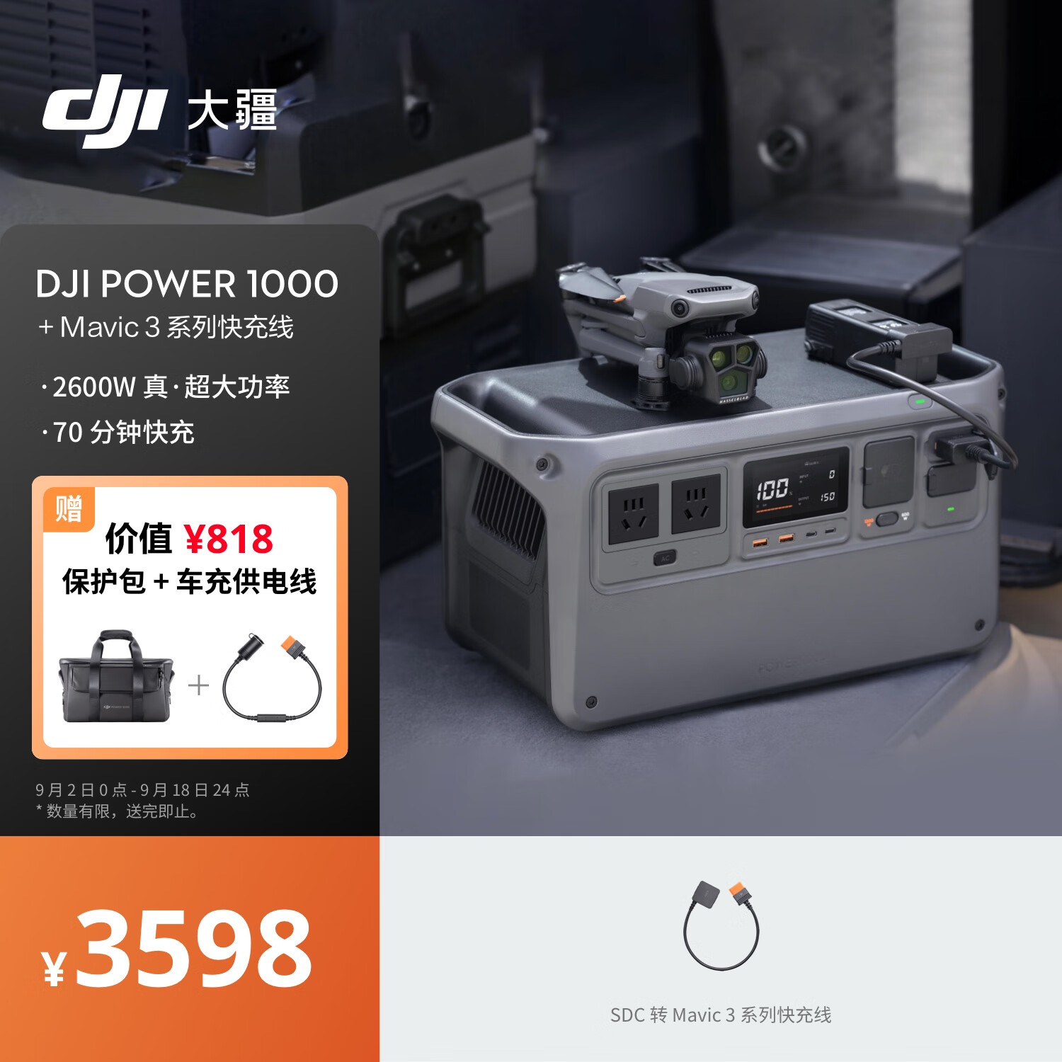 大疆【2600W真大功率】户外移动电源 1度电 220V大容量 露营自驾 DJI Power 1000+Mavic 3 系列快充线价格:3598.00元!