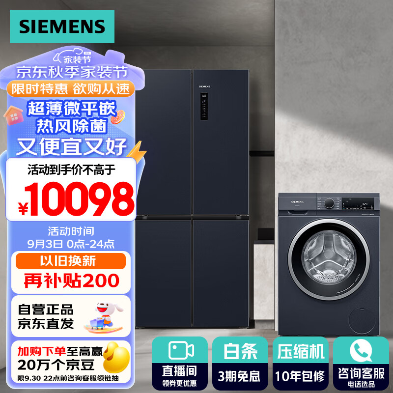 西门子(SIEMENS)冰洗套装497L超薄微平嵌十字星冰箱+10kg洗烘一体KC505680EC+WN52A1X14W价格:10098.00元!