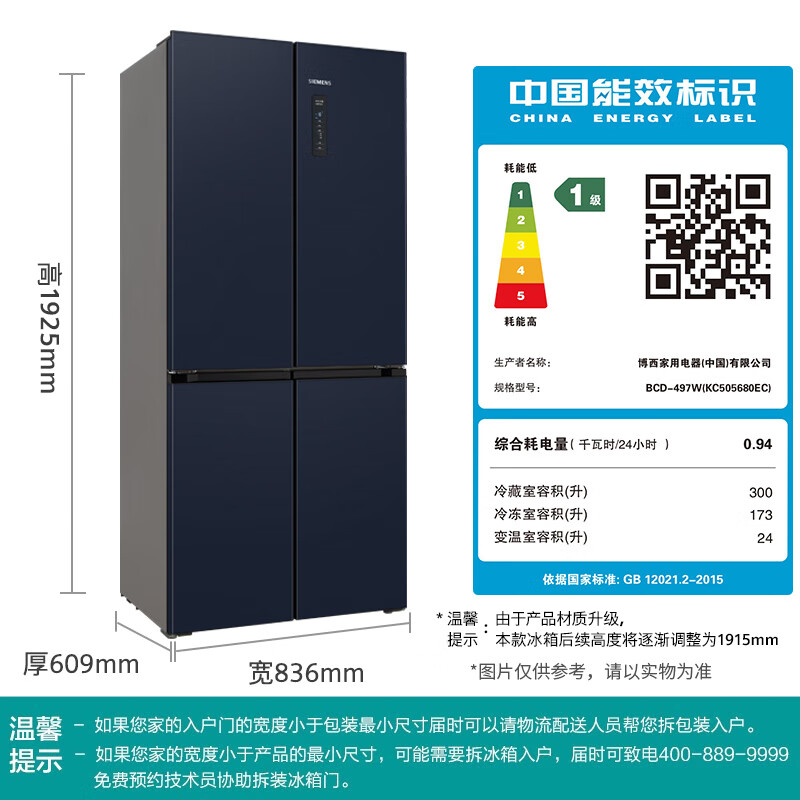 西门子BCD-497W(KC505680EC)配置参数: