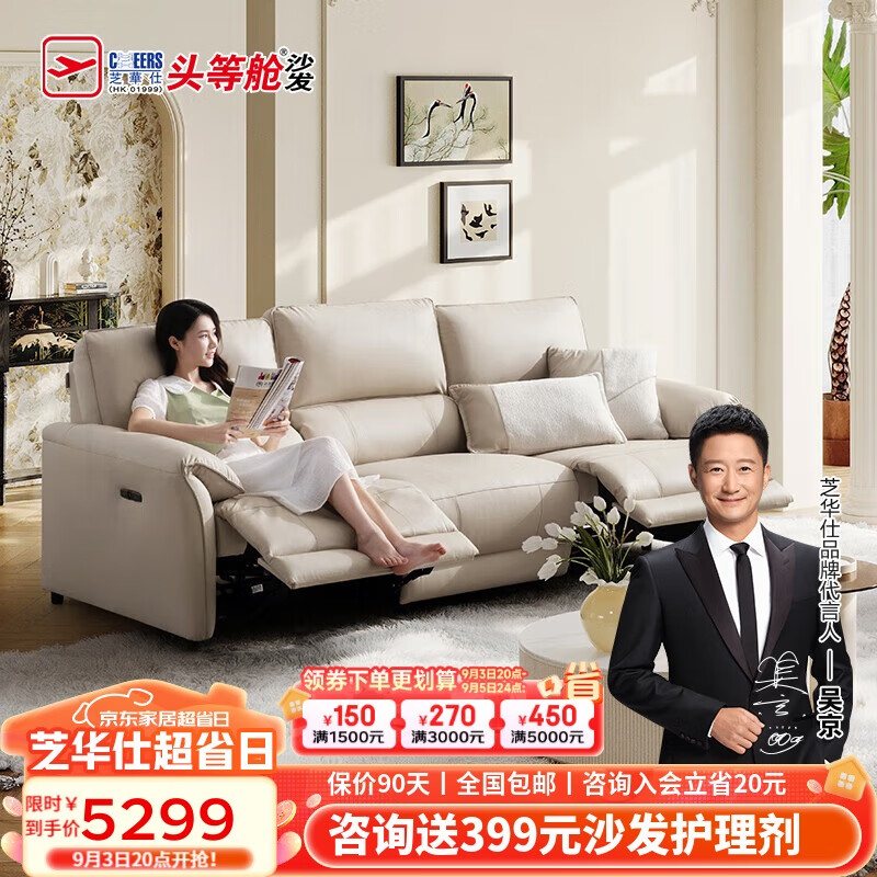 芝华仕(CHEERS)头等舱零靠墙现代简约真皮功能沙发直排轻奢芝华士11323白三双价格:5299.00元!