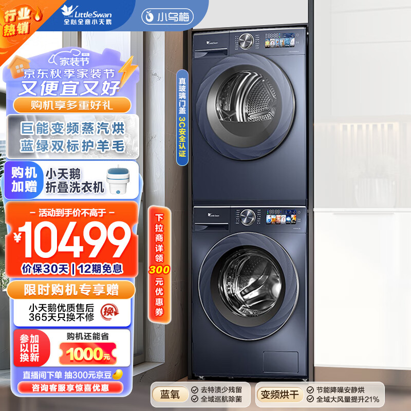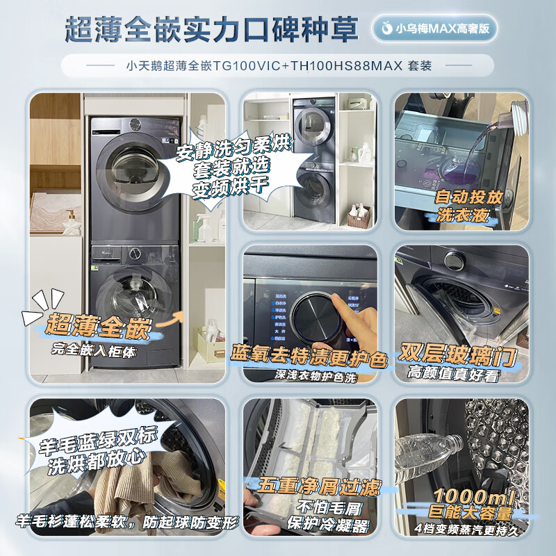 小天鹅(LittleSwan)洗烘套装 10KG滚筒洗衣机+变频热泵烘干机 超薄全嵌 蓝氧【小乌梅MAX高奢版】TG100VIC+S88MAX价格:10499.00元!